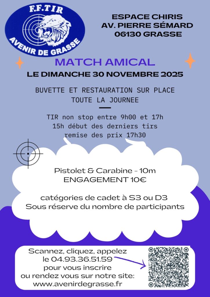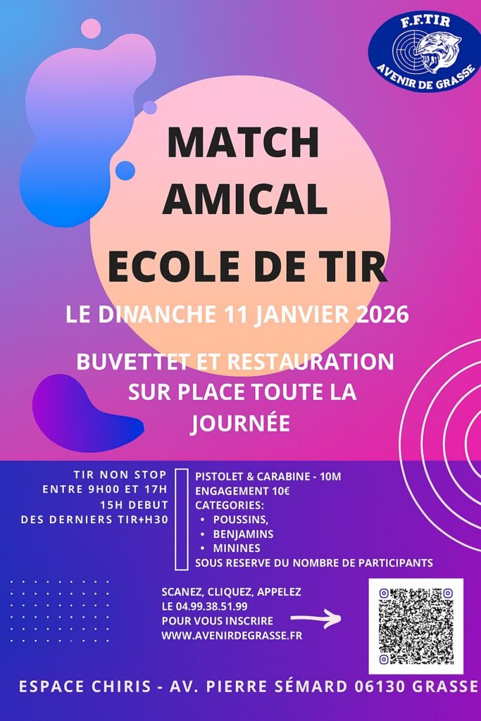 Accueil/Actualités/MATCH AMICAL AVENIR DE GRASSE Actualités MATCH AMICAL AVENIR DE GRASSE Ligue de Tiril y a 4 semaines 87 Moins d’une minute Facebook Twitter Linkedin Tumblr Pinterest Reddit WhatsApp MATCH AMICAL 10M DIMANCHE 30 NOVEMBRE 2025 MATCH AMICAL ECOLE DE TIR 11 JANVIER 2026 Ligue de Tiril y a 4 semaines 87 Moins d’une minute Facebook Twitter Linkedin Tumblr Pinterest Reddit WhatsApp Partager Facebook Twitter Linkedin Tumblr Pinterest Reddit VKontakte Partager par email Imprimer
